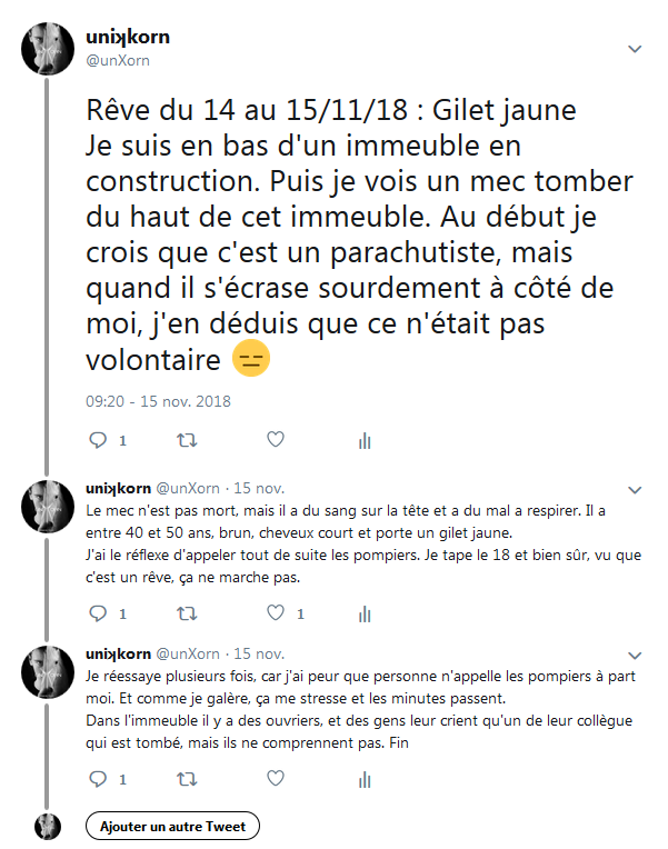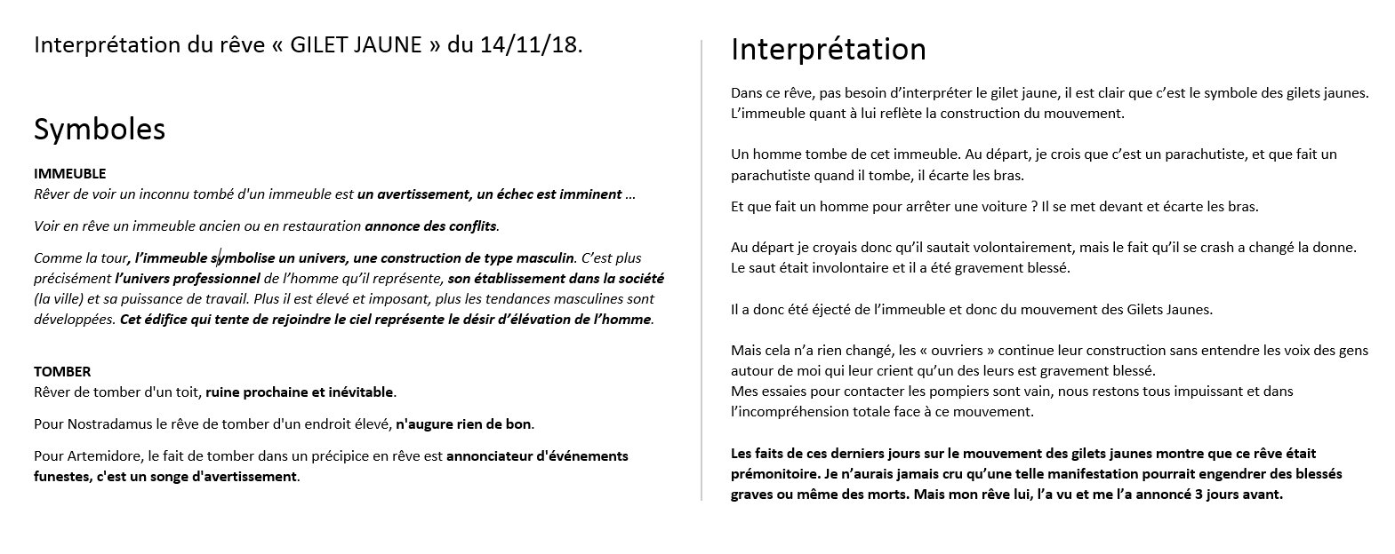 La nuit 14 au 15 novembre 2018, je fais un rêve dans lequel un Gilet Jaune chute d'un immeuble. Je le prends immédiatement comme un rêve prémonitoire malgré son intensité basse aux allures de rêve normal.