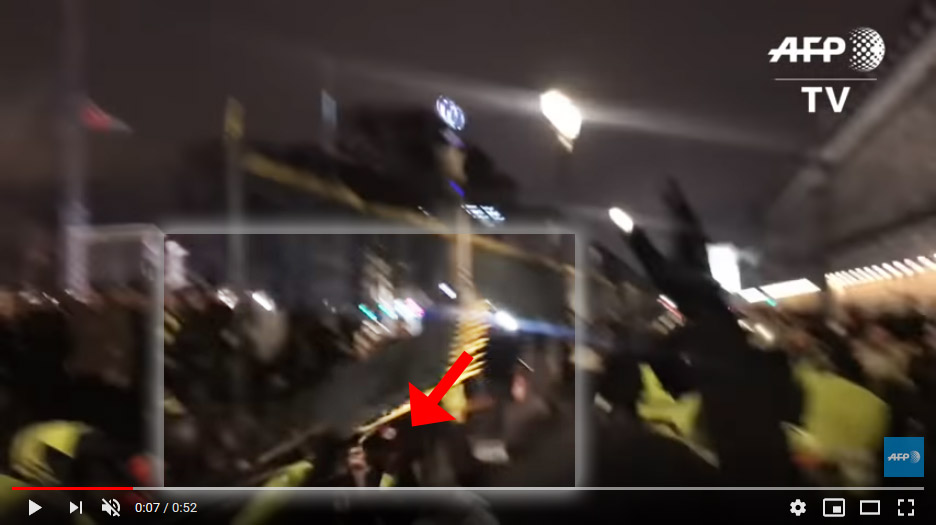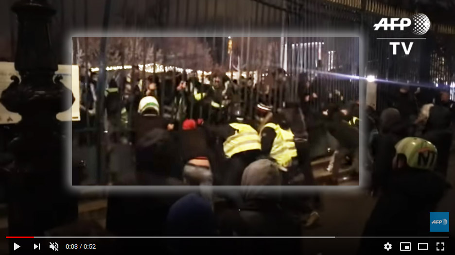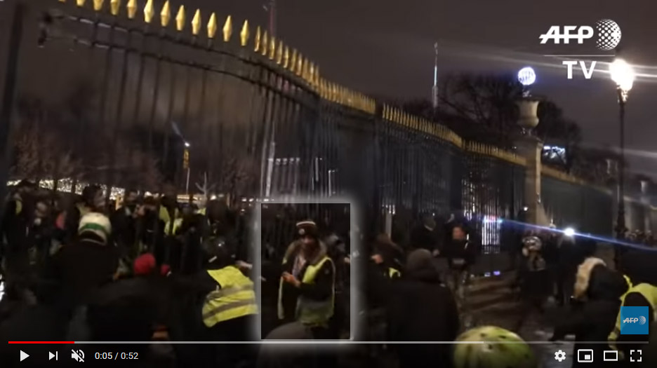 On voit bien ici que le gilet jaune est complètement à l'ouest et que la grille lui tombe dessus sans qu'il s'en aperçoive. Au moment où la grille s'effondre sur lui, il est juste à côté de celui qui filme, tout comme il est juste à côté de moi dans mon rêve.Quand il s'écrase sourdement à côté de moi, j'en déduis que ce n'est pas volontaire.