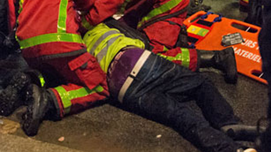 Le Gilet Jaune n'est pas mort, mais il a du sang sur la tête et du mal à respirer. Il a entre 40 et 50 ans, brun, cheveux court et porte un gilet jaune.