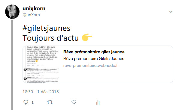 Même si le symbole du Gilet Jaune était assez clair, comme il y avait eu beaucoup de bruit sur ce mouvement avant que je fasse le rêve, je suis resté prudent quant à son annonce. Je soupçonnais à 30% une autosuggestion inconsciente.